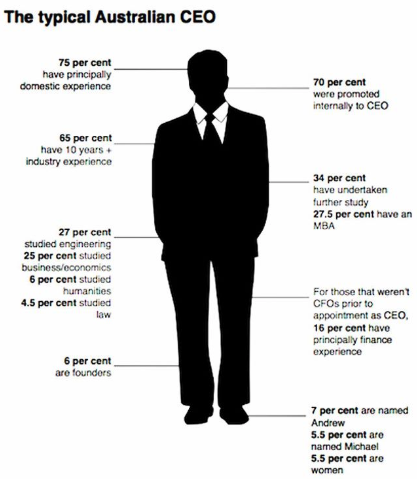 What we do know is that the typical Australian CEO is indeed a guy named Andrew with finance experience and an MBA, who has followed an internal career track to CEO. He's not entrepreneurial and has primarily domestic experience.